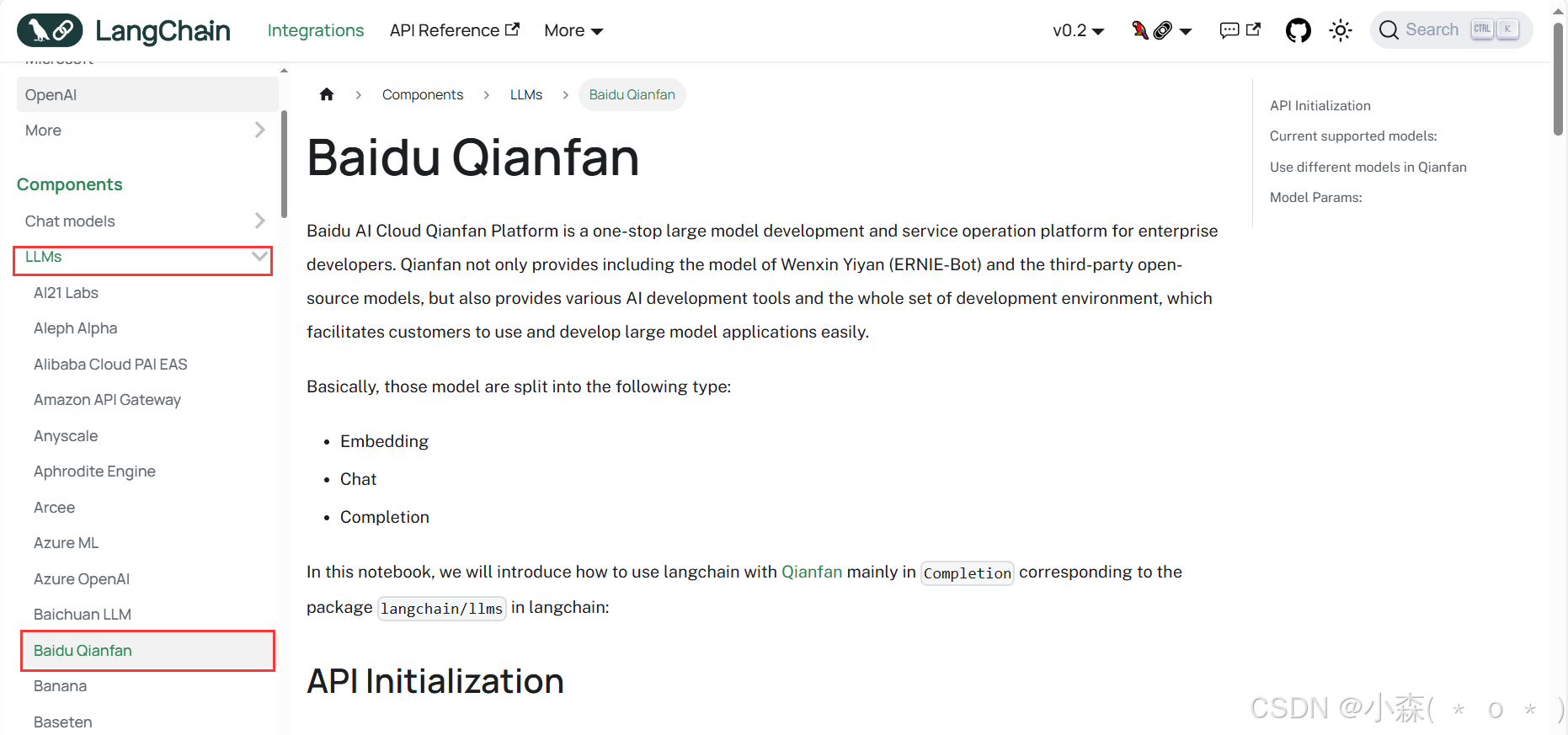 可以看到LLMs是我们的LLMs模块,BaiduQianfan是其中的库。