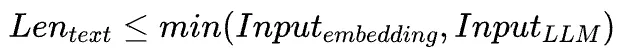 看到上述框架图绝大多数人应该有的一个疑问。如果深入思考的话会发现 embedding(text2vec,文本转化为向量)以及 LLM encoder 对输入 tokens 都有限制。embedding 会将一个 text(长字符串)的语义信息压缩成一个向量,这是他的能力,但我们需要重点关注他的局限性,其中之一就是 text 包含的 tokens 有限制,一段话压缩成一个向量是 ok,但一本书压缩成一个向量可能就丢失了绝大多数语义。LLM encoder tokens 的限制在模型结构(利用 next token 进行 pre train)是就定义了,后续也无法更改,而 in-context 本质是把语料注入到 prompt,整个 prompt 不能超过 LLM 的 tokens 限制, 汇总如下公式: