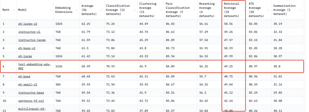 图 2 huggingface embedding benchmark 中 openAI 发布的 text-embedding-ada-002 (2021/09 )最大输入 tokens 限制是 8191,输出维度是 1536,在 Retrieval 中 top1 的准确率是 49.25%。这组数据表明 openAI embedding 模型具有非常棒的语义表达能力,能够非常好的将问题、答案映射到相近的语义向量空间中,可以说该 embedding 模型是业界最强的映射 QA 能力的模型。