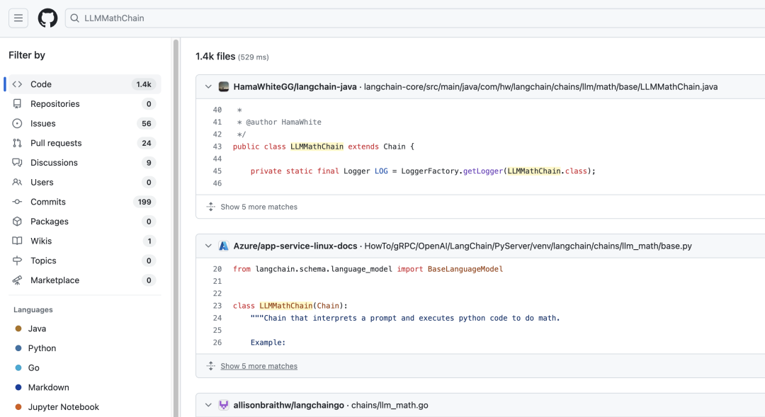 通过"LLMMathChain"关键字搜索 github 可以发现,包含 LLMMathChain 的代码量在 1 千条以上。