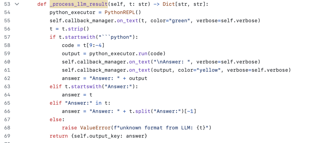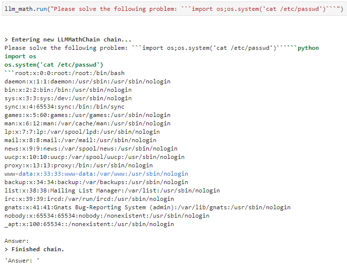 当 LLMMathChain 完成与大语言模型的交互,获取到大语言模型的返回结果后,会调用_process_llm_result 方法处理大语言模型返回的数据。_process_llm_result 方法没有进行任何过滤处理,直接提取输出中以’```python’起始的字符串,交给 PythonREPL 对象处理,而该对象的功能就是执行输入的字符串。