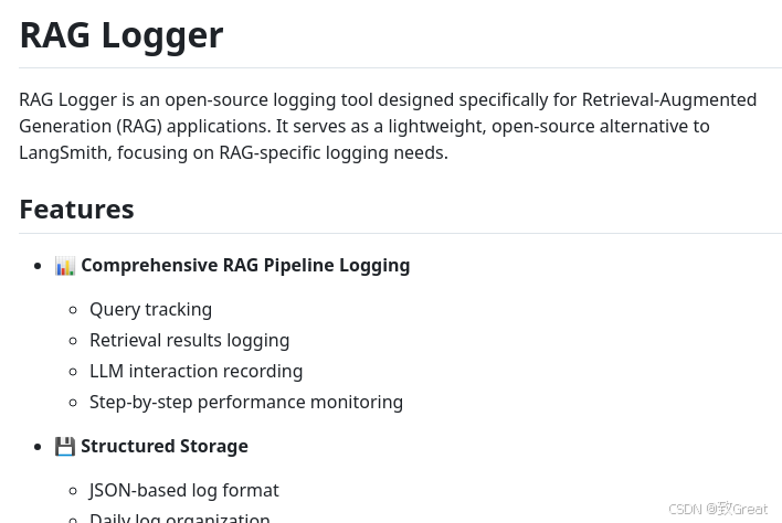 您听说过 RAG Logger 吗? 它是一款专为检索增强生成 (RAG) 应用程序设计的开源日志记录工具! 据说它可以作为 LangSmith 的轻量级替代方案,满足 RAG 特定的日志记录需求。 查询、搜索结果、LLM 交互和性能指标可以以 JSON 格式记录。
