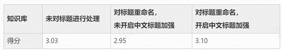 4、对文档名称进行处理**:**由于原来的政策文件,在导出时文件名会进行简化,如too_long_发展行动方案。因此,人工对文件进行重命名,上传相同文件构建知识库,同时在构建知识库时勾选【开启中文标题加强】选项,发现重命名文件对结果的提升效果不明显,但勾选【开启中文标题加强】选项后,回答的无关信息减少,效果有所提升。