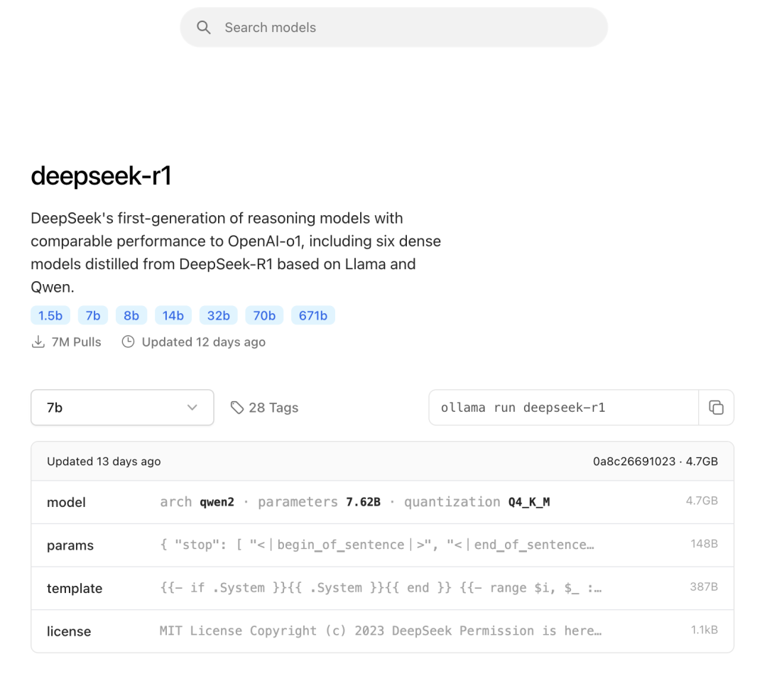 在ollama官网顶部的搜索框里,输入“deepseek-r1”,结果页里默认选中的是“7b”模型,选择你想要的模型。