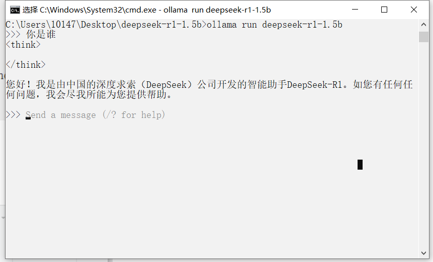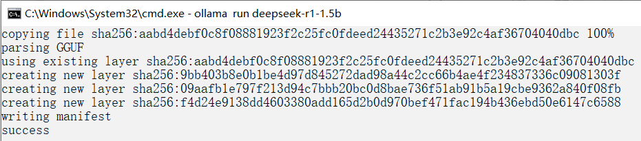 在命令行中输入以下命令,Ollama将根据Modelfile中的配置自动安装 deepseek-r1-1.5b.gguf 文件: