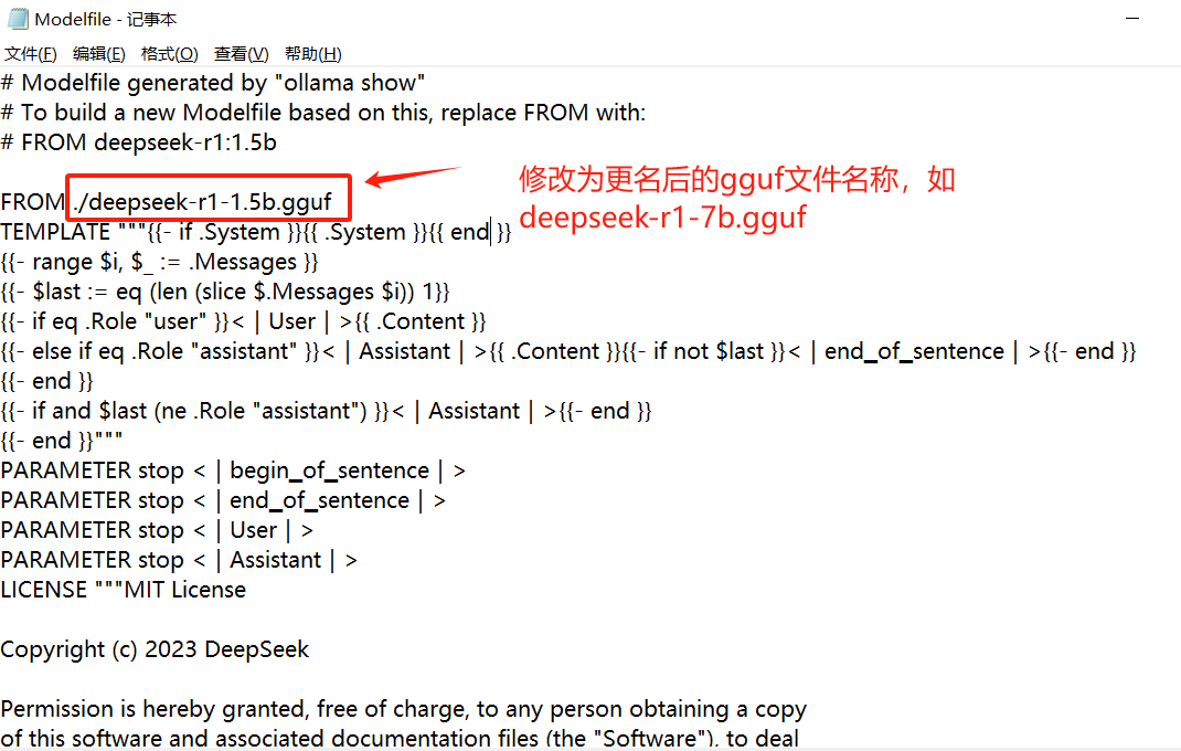 因此推荐有安装其他大小DeepSeek模型的用户,在其他可联网的机子中运行Ollama,直接下载对应大小的DeepSeek大模型,如7B,下载之后至模型文件夹中(C:\Users\你的用户名文件夹.ollama\models\blobs),里面存放的是你下载的模型,我们在这里获取到下载的7B文件(文件名通常是一个很长的ID,可以通过下载时间最近和文件大小最大进行判断),将其改名为deepseek-r1-7b.gguf,之后还需要修改Modelfile中的FROM字段内容,修改完成拷贝至离线环境便可按照前文所述进行离线安装。