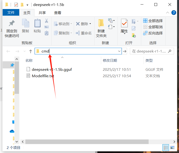 从百度网盘下载Deepseek R1 1.5b模型的压缩包(deepseek-r1-1.5b.rar),解压后进入解压后的文件夹,并在解压后的文件夹键入cmd
