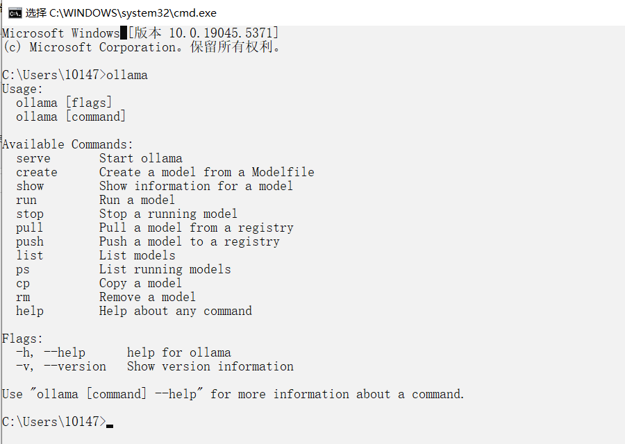 在命令行中输入 ollama,如果看到以下输出,说明Ollama已成功安装。