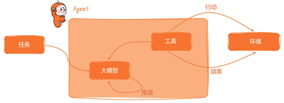 Agent 通过接口连接大模型,获得生成内容、语言理解、决策支持能力,再通过外部工具执行复杂任务,或者与环境交互。