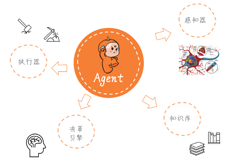 要从技术上实现上述特性,Agent 通常需要包含四大核心组件。感知器用来收集环境信息;知识库存储和管理有关环境和自身状态的信息;决策引擎分析感知的信息,做出决策;执行器在环境中采取行动。