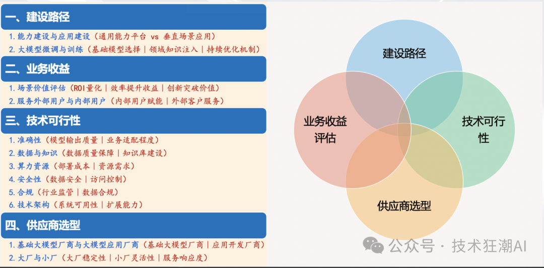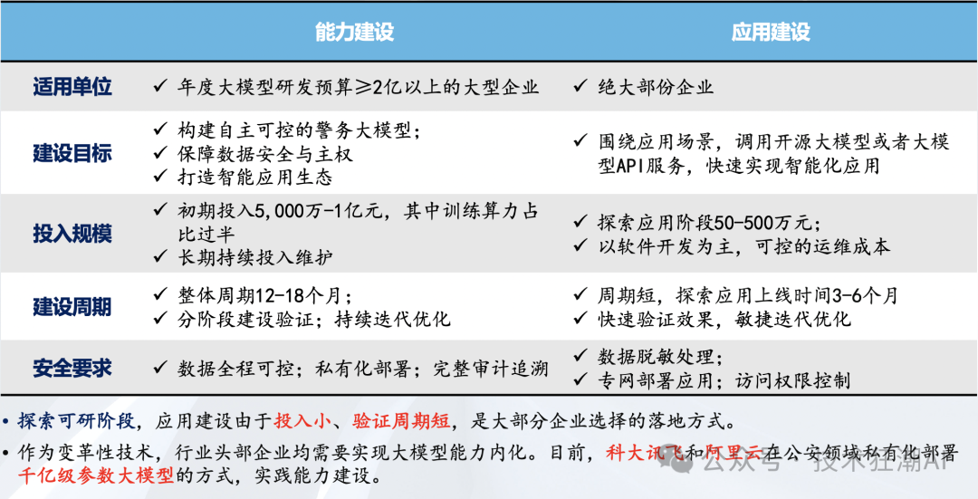 在大模型技术落地实践中,企业主要面临「能力建设」和「应用建设」两种路径选择。能力建设模式主要面向年度研发预算在2亿以上的大型企业,通过构建自主可控的大模型,实现数据安全与主权掌控。这种模式初期投入高达5,000万到1亿元,建设周期长达12-18个月,需要持续投入维护,适合对数据安全要求极高的行业头部企业,比如科大讯飞和阿里云等大模型头部企业以及一些像智谱、百川、Kimi、零一万物等独角兽企业。
