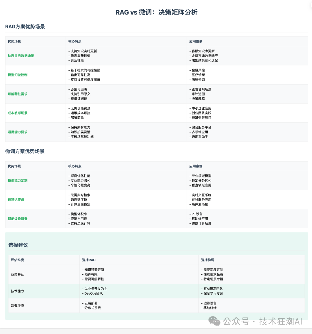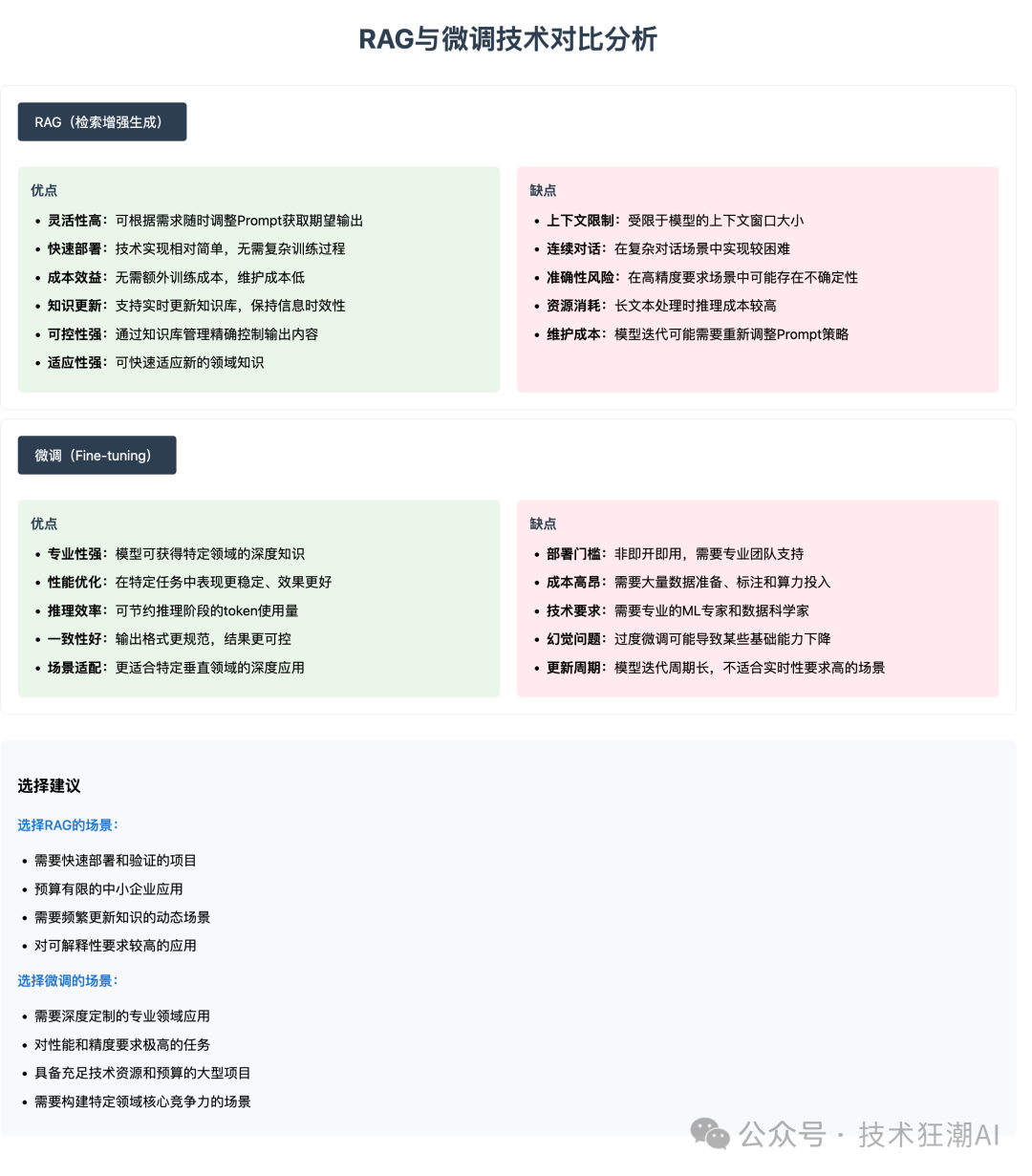 与大部分的IT技术一样,无论是微调还是RAG,都有其优点和局限性。选择合适的技术方案需要综合考虑多个因素,包括但不限于:应用场景的特点、性能要求、资源约束、团队能力等。随着技术的不断发展,这些方案的优劣势也在动态变化。下面我们将从多个维度详细对比这两种技术方案的特点,以供参考。