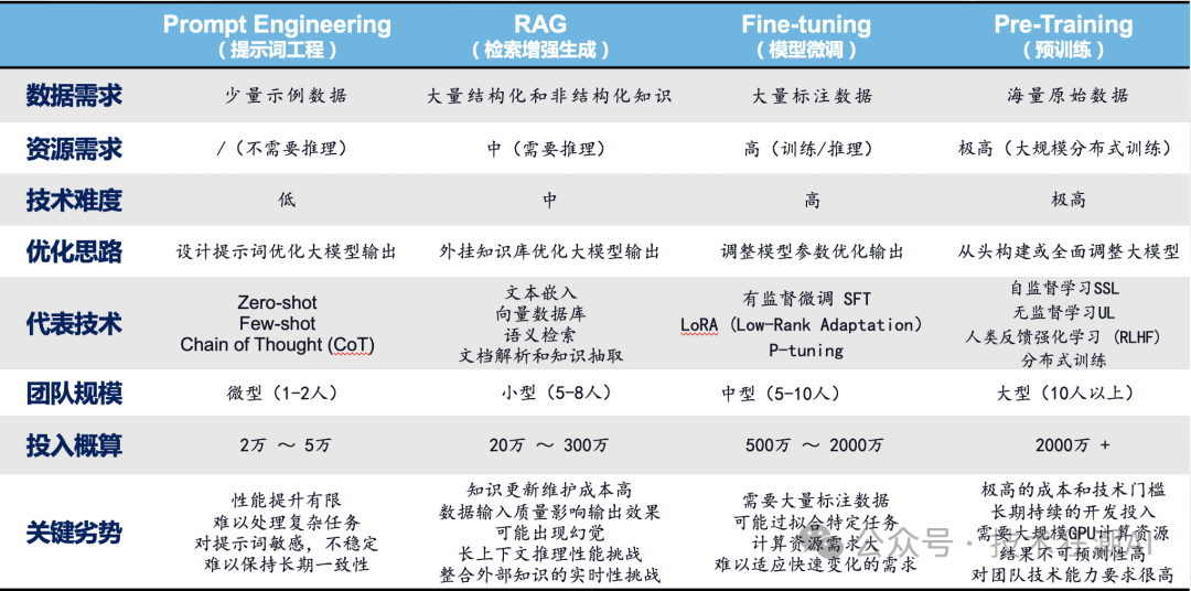 从以上的对比分析结果可以看到,最轻量级的是Prompt Engineering(提示词工程)路径,仅需2-5万投入,1-2人小团队即可开展。通过精心设计提示词优化模型输出,适合快速验证和简单场景,但难以处理复杂任务。其次是RAG(检索增强生成)方案,投入在20-300万之间,需要5-8人团队协作。通过结合企业知识库,可以有效提升模型输出质量,但面临知识更新维护成本高等挑战。