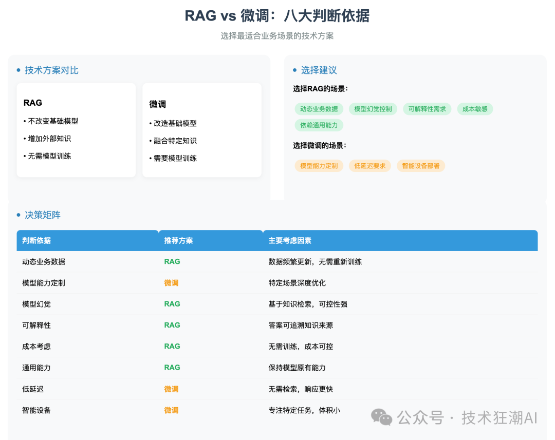 从前面我们的分析中可以看到,在大模型技术实际落地过程中,RAG(检索增强生成)和微调(Fine-tuning)是两种主流的技术路径,它们各具特色,适用于不同场景。让我们从多个维度深入分析这两种方案的选择依据。