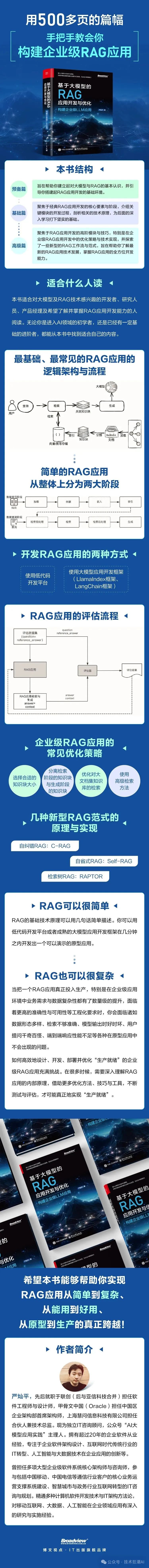 在当前大模型应用如火如荼的背景下,RAG技术无疑是最受关注的应用方向之一。然而,真正能够系统性地介绍企业级RAG应用开发与优化的技术书籍却凤毛麟角。今天要向大家推荐的这本**《基于大模型的RAG应用开发与优化 — 构建企业级LLM应用》**,恰恰填补了这一领域的空白。