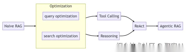 缺点:检索质量依赖关键词匹配,易受问题表述影响;生成阶段无法迭代优化。 这一阶段是RAG的“雏形”,适用于简单问答,但无法处理复杂查询。