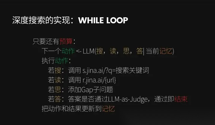 DeepSearch(或DeepResearch)是Agentic RAG的典型应用,代表企业包括Jina AI、Google Gemini等。其核心是模型驱动的深度搜索循环: