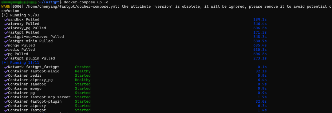 运行命令"docker-compose up -d"即可,docker根据docker-compose.yml内容自动下载FastGPT及其依赖的镜像进行安装,完成后如下: