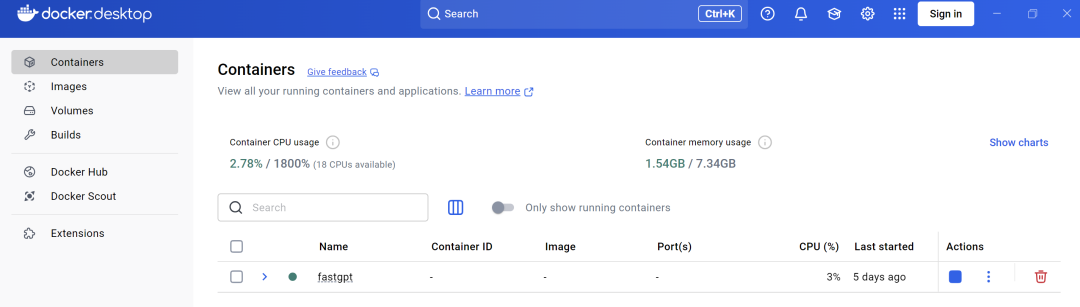 这时到Docker Desktop界面中,能看到容器列表中已经有fastgpt:
