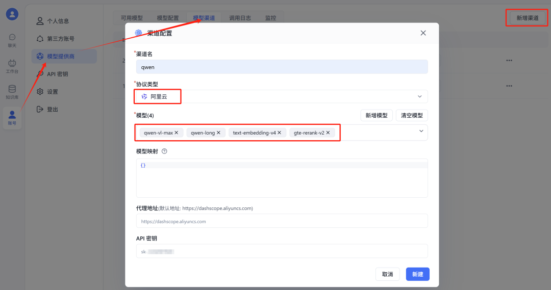 在模型渠道中新建渠道,协议类型选择阿里云,模型选择自己要使用的模型,例如大模型使用qwen-long,多模态模型使用qwen-vl-max,embedding模型使用text-embedding-v4等,代理地址默认就是对的,API密钥填上自己申请的API key。