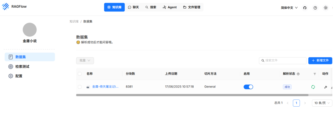 上传一个倚天屠龙记小说,作为数据源;然后点击解析,等待解析完成!