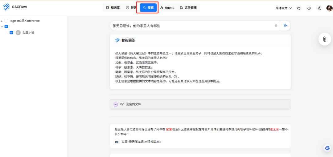 点击搜索,选择刚才创建的知识库,即可进行问答: