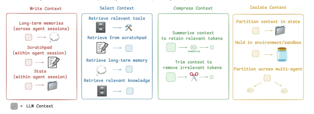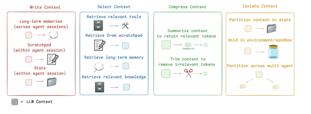 四大策略(写入、选择、压缩、隔离) 是构建代理时常见的手段,需要根据任务特性灵活组合