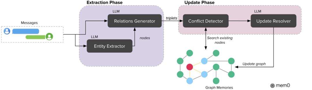 基于图的Mem0架构展示了实体提取和更新阶段。提取阶段使用LLMs将对话消息转换为实体和关系三元组。更新阶段在整合新信息到现有知识图谱时采用冲突检测与解决机制。
