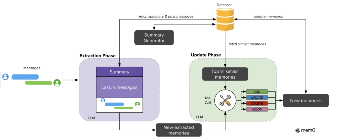 图:Mem0系统的架构概览,展示了提取和更新阶段。提取阶段处理消息和历史上下文以创建新的记忆。更新阶段将这些提取的记忆与类似的现有记忆进行评估,通过工具调用机制应用适当的操作(CRUD)。数据库作为中央存储库,提供处理和存储更新记忆所需的上下文。