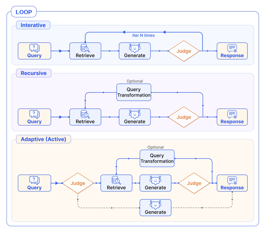 自适应Agent RAG, 与上述Modular RAG中的Adaptive retrieval一样,语义上都是在各个环节引入了LLM判断,并在引入LLM评测实现Loop自迭代。