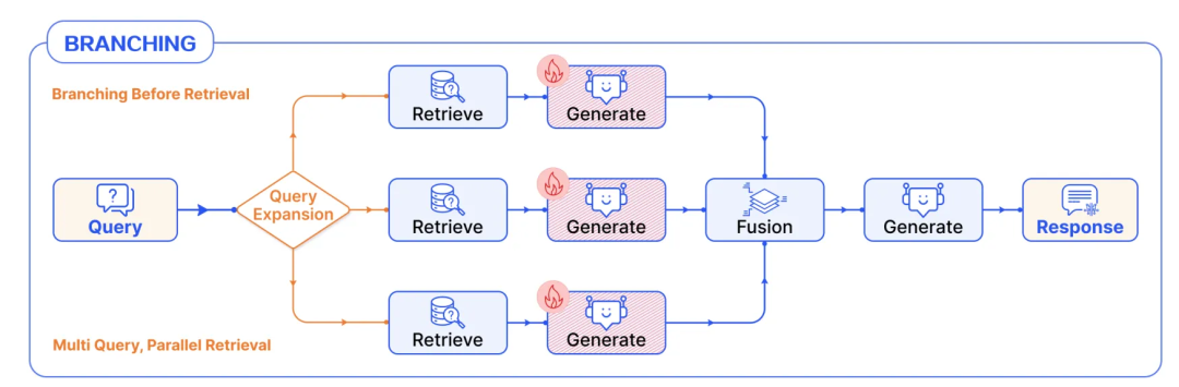 RAG流中存在多个并行的分支,各自处理后随之合并到一起,这种情况多用于要增加生成结果的多样性而引入