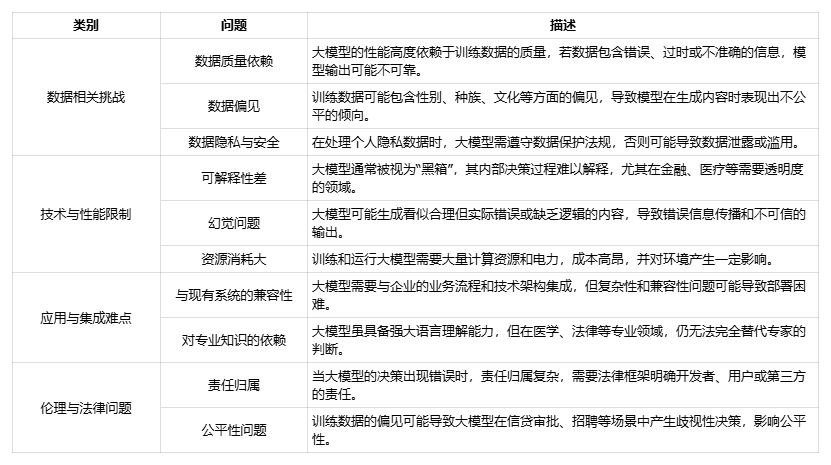 尽管大模型在多个领域展现了强大的能力,但它仍然存在诸多局限性和挑战。这些问题主要体现在数据质量、技术与性能、应用集成,以及伦理与法律等方面。