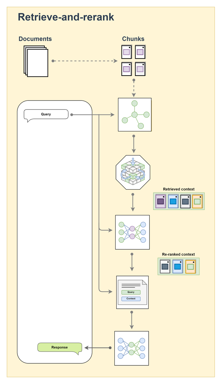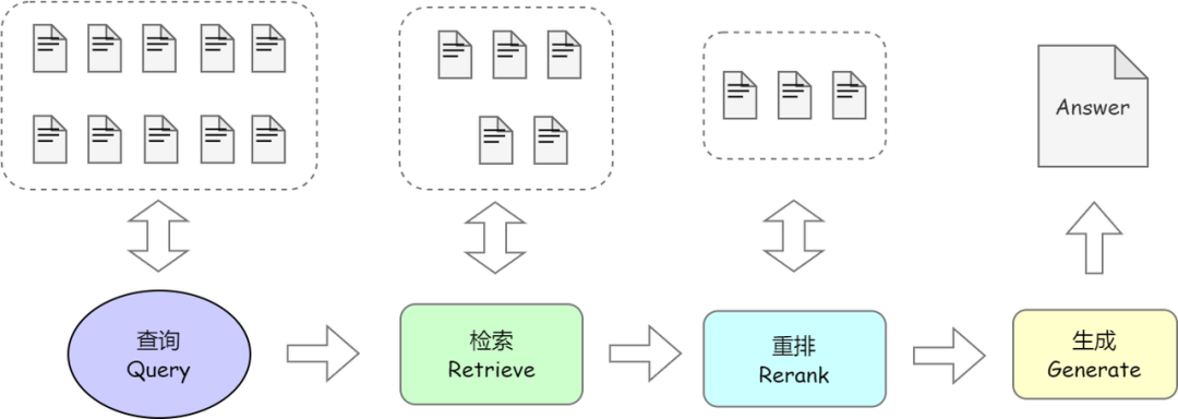 用户输入一个查询 ➝ 检索模块从知识库中找到一批初步相关的文档(向量检索) ➝ 对检索到的文档进行重排序,以筛选最相关的信息 ➝ 生成模块使用重排序后的文档作为上下文,生成最终回答。