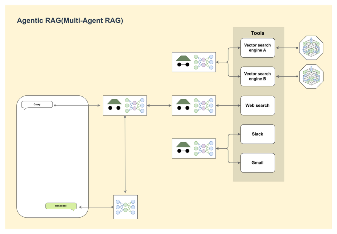 Agentic RAG Multi-Agent 是一种利用多个专门 AI Agent 协同工作的架构,它可以调用不同的工具(如向量搜索、网页搜索、Slack、Gmail 等),以处理复杂的、多源数据环境中的任务。
