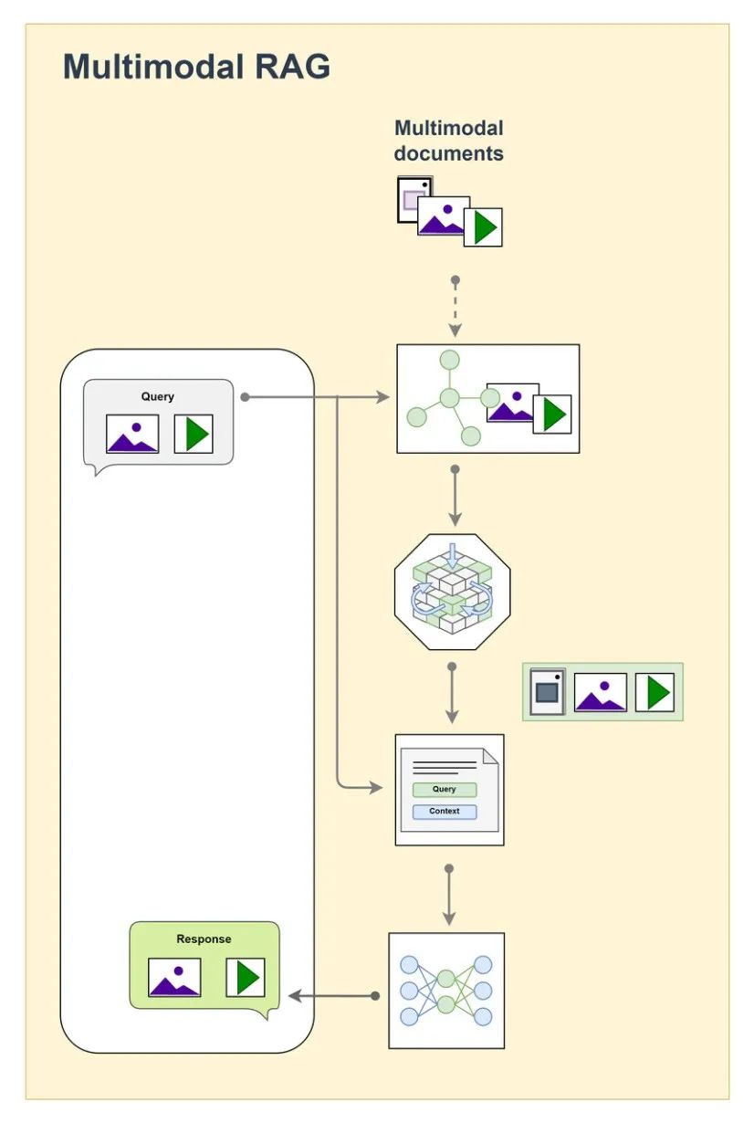 用户输入可以是文本或其他模态(图像等) ➝ 多模态检索模块找到与输入相关的多模态上下文 ➝ 将检索结果传递给生成模块 ➝ 结合上下文信息生成多模态回答。