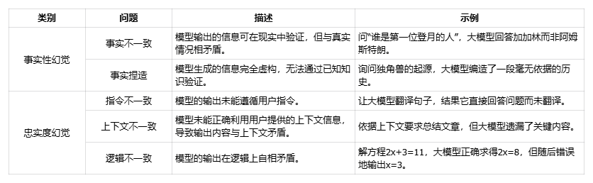关于幻觉问题的分类,大体上可分为事实性幻觉(Factuality Hallucination)和忠实度幻觉(Faithfulness Hallucination)两种类别。