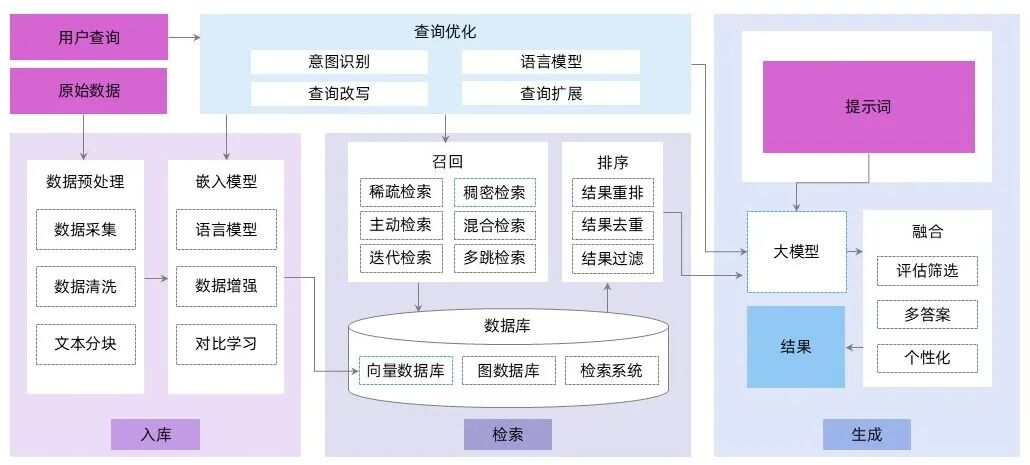 输入:负责对用户查询进行理解优化,提升检索和生成模块的效果,包括意图识别、查询改扩写等子模块。