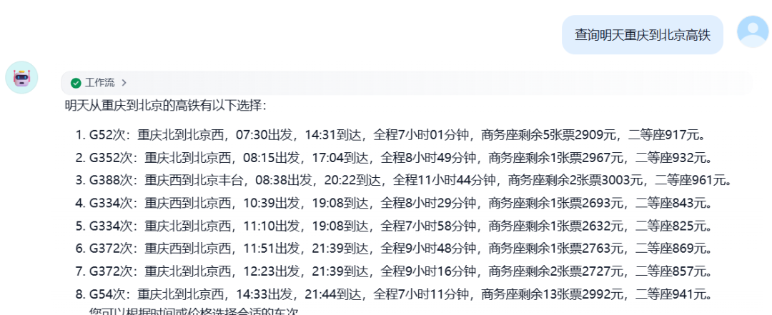 输入:查询明天重庆到北京高铁