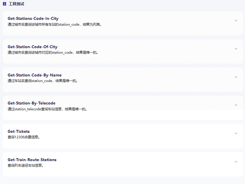 对铁路12306MCP的6个工具进行简单测试,可以看看在我们搭建完智能体后,所有工具输出的结果是否和智能体输出的结果一致。