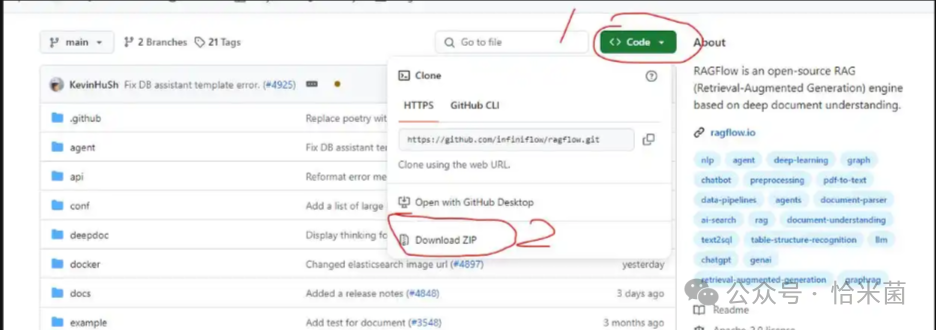 git clone https://github.com/infiniflow/ragflow.git也可以选择直接下载