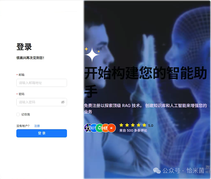访问 http://localhost(或 Docker 分配的 IP,端口可以选择默认的),进入 RagFlow 登录页。