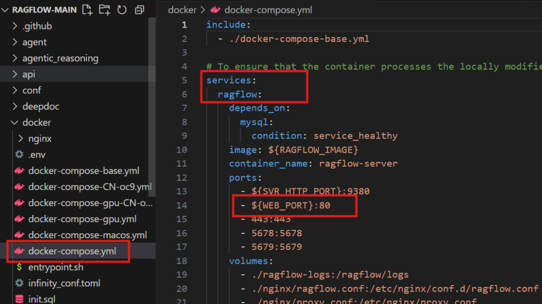 在docker-compose.yml文件里,services.ragflow.ports下新增端口号: