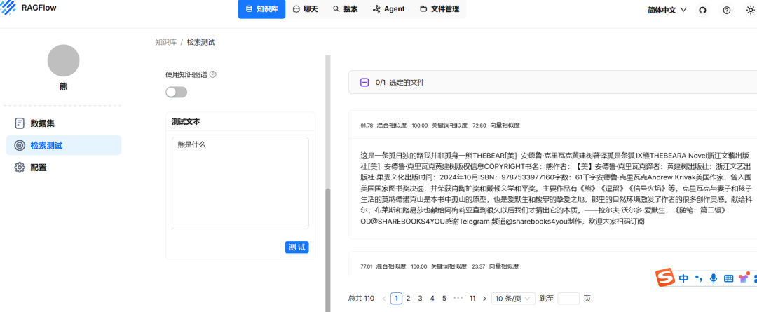 在检索测试里输入测试文本,简单测试一下,系统自动展示相关段落并生成摘要