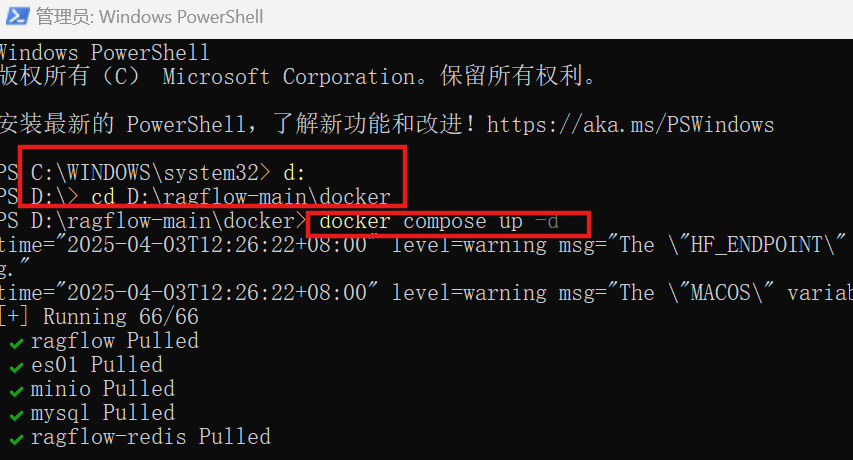 以管理员打开PowerShell,进入ragflow源码里的docker目录,并在命令行中输入以下命令: