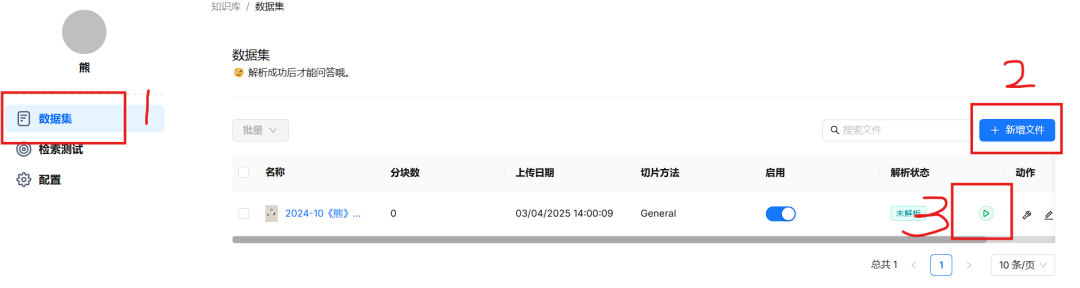 创建知识库,先配置,然后在数据集栏里新增文件,并解析文件
