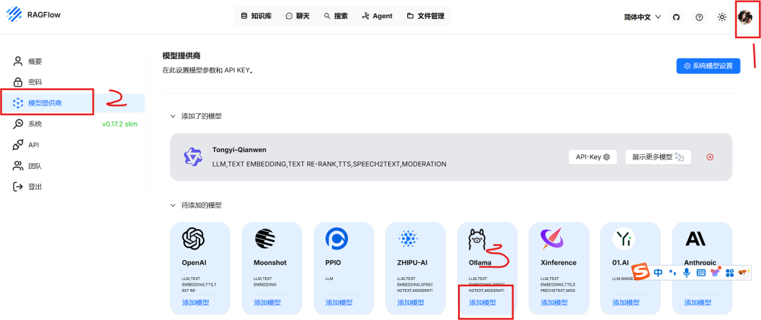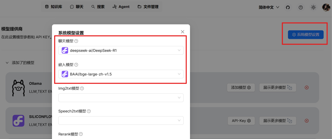 在系统模型设置里设置好聊天模型和嵌入模型。