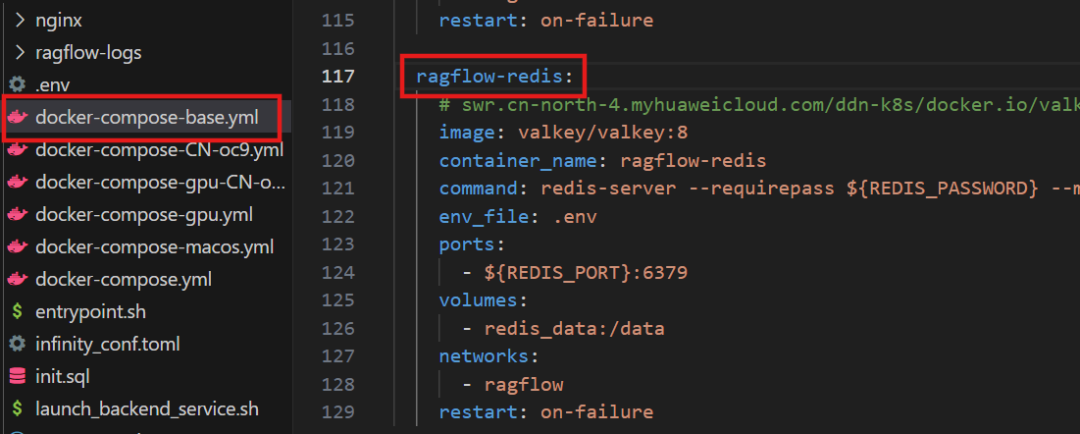 docker-compose-base.yml文件里,将services下redis服务名称改为ragflow-redis