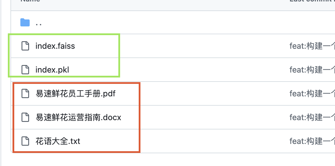 三个需要加载的文档, index.faiss和index.pkl是我已经做好向量化的文件,如果不想自己做向量化或者想省一些token,可以直接读取这两个文件。代码段如下: