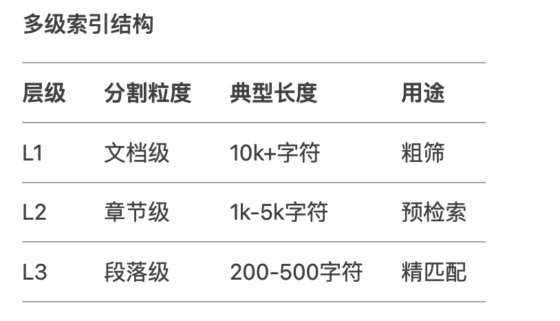 除了采取上面的基本分割方式,然后还可以结合层次分割优化不同粒度的索引结构,提高检索匹配度。