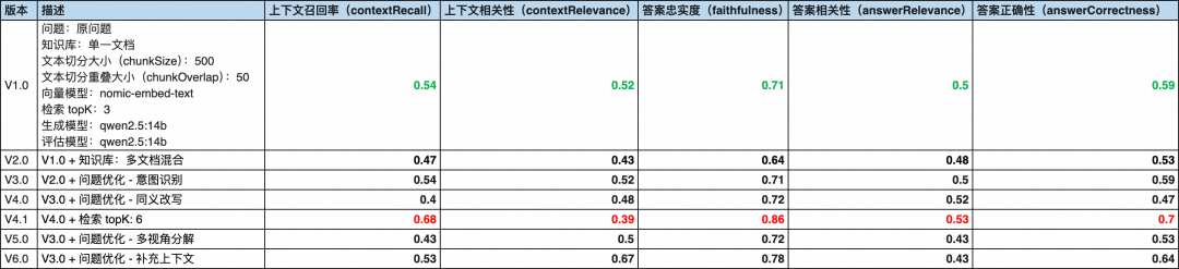 此时我们可以看到,相对于 V3.0,除了上下文相关性得分下降了(因为检索文档片段多了,就可能会包含更多与问题无关的文档片段),其他指标都有提升来,基本复合预期。